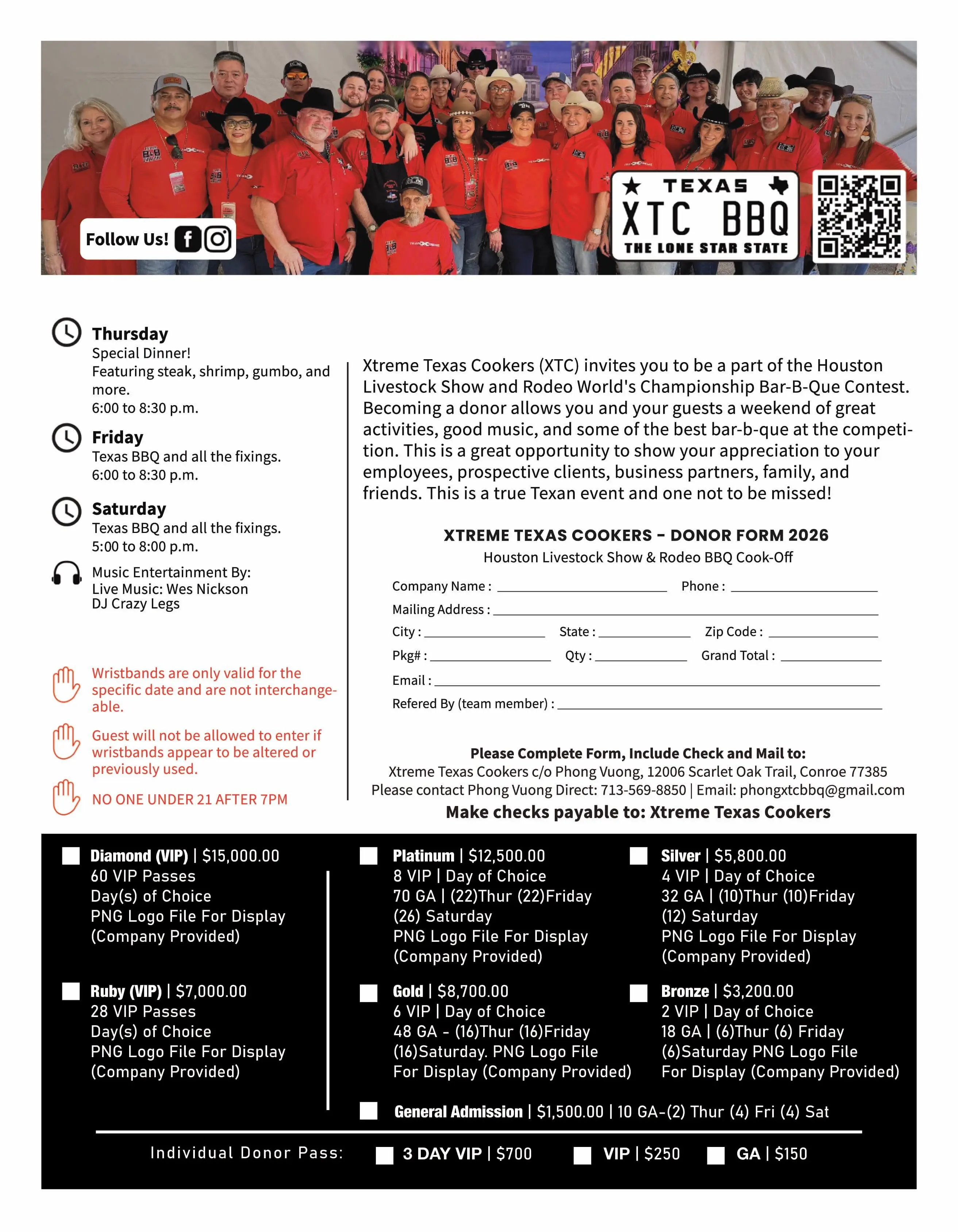 Become part of Texas’ biggest BBQ tradition! Xtreme Texas Cookers invites local businesses and corporate sponsors to join us at major competitions like the Houston Livestock Show & Rodeo BBQ Cook-Off and other statewide events. Our Corporate BBQ Sponsorships offer brand exposure, exclusive event access, and unforgettable hospitality experiences.